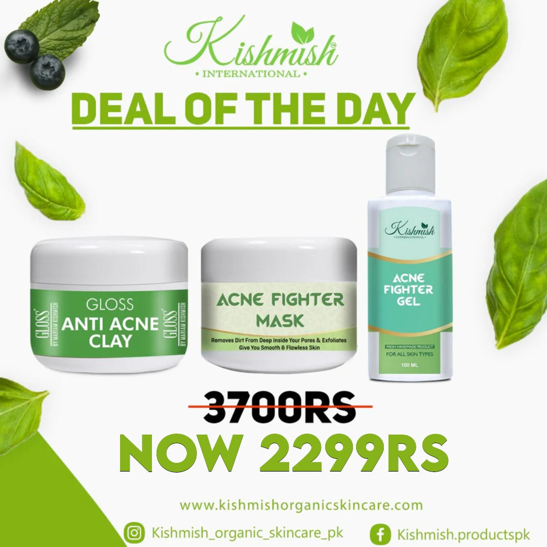 Every cosmetic company offers different product deals to its valued customers. These deals may be deal of the day, deal of the week or deal of the month etc. Therefore, Kishmish Organic Skincare is also following this tradition of providing its customer good deals. Watch Now! We offer deals on daily basis. We give special deals on every event like deal for Independence Day or alike others. Henceforth, our special deal for today is Anti-Acne Clay + Acne Fighter Mask + Acne Fighter Gel. Shop more!