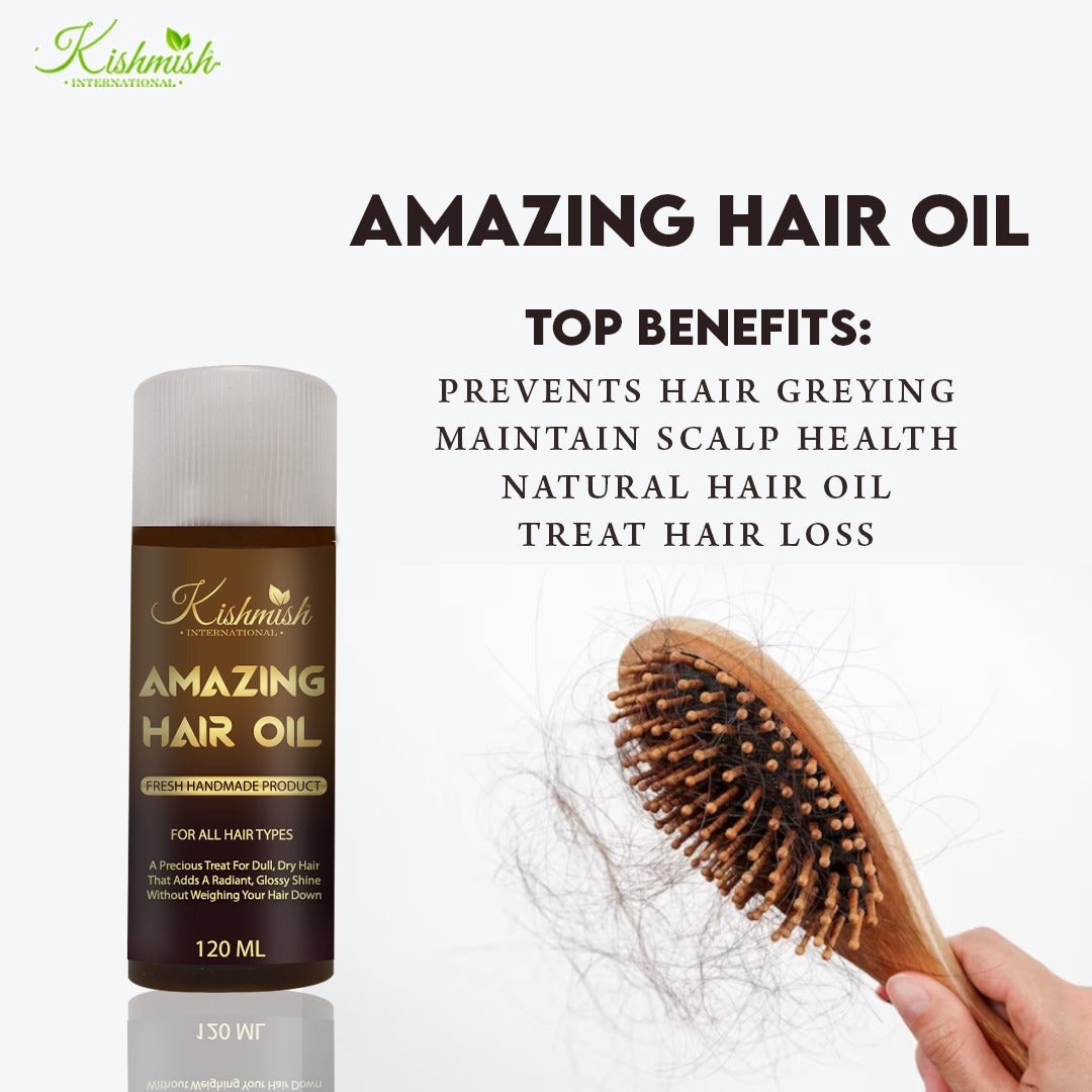 Kishmish Amazing Hair oil is made up of Apricot Oil, Almond Oil, Coriander Oil, Walnut Oil, Rapeseed Oil, and Blackseed Oil. Amazing Hair Oil is used for all kinds of Hair Issues, repair damaged hair, repair bald patches, hair loss, slow hair growth, etc.Amazing hair oil has coconut as one of its main ingredients and we all are well known about the benefits of coconut regarding hair that why native people around coastal areas have shiny and thick hair due to the availability of coconut. Moreover, those people who are worried due to greying of their hair must use Kishmsih Organic Skincare’s Amazing hair Oil.